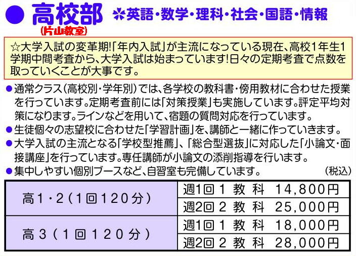 学校進度に合わせた個別指導も行っています。曜日・時間帯などお問い合わせください。