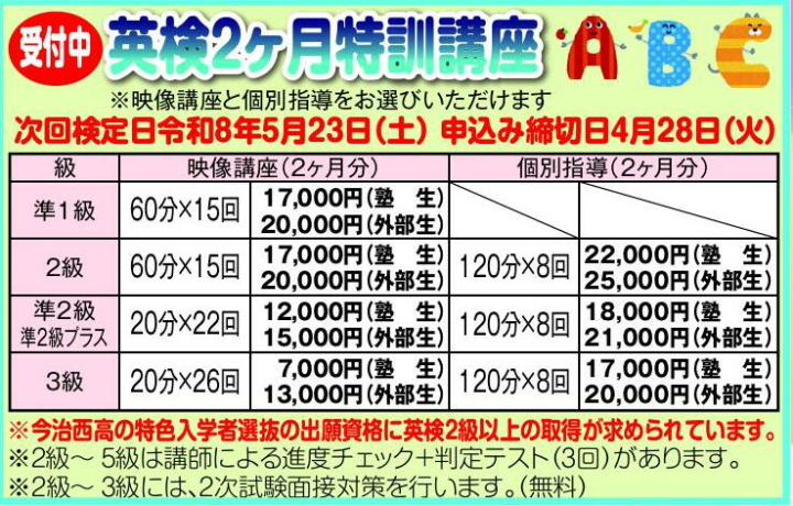 英検特訓講座は、3月2日(月)より受付いたします。