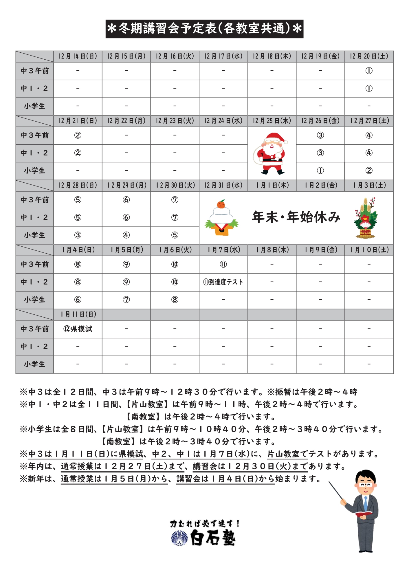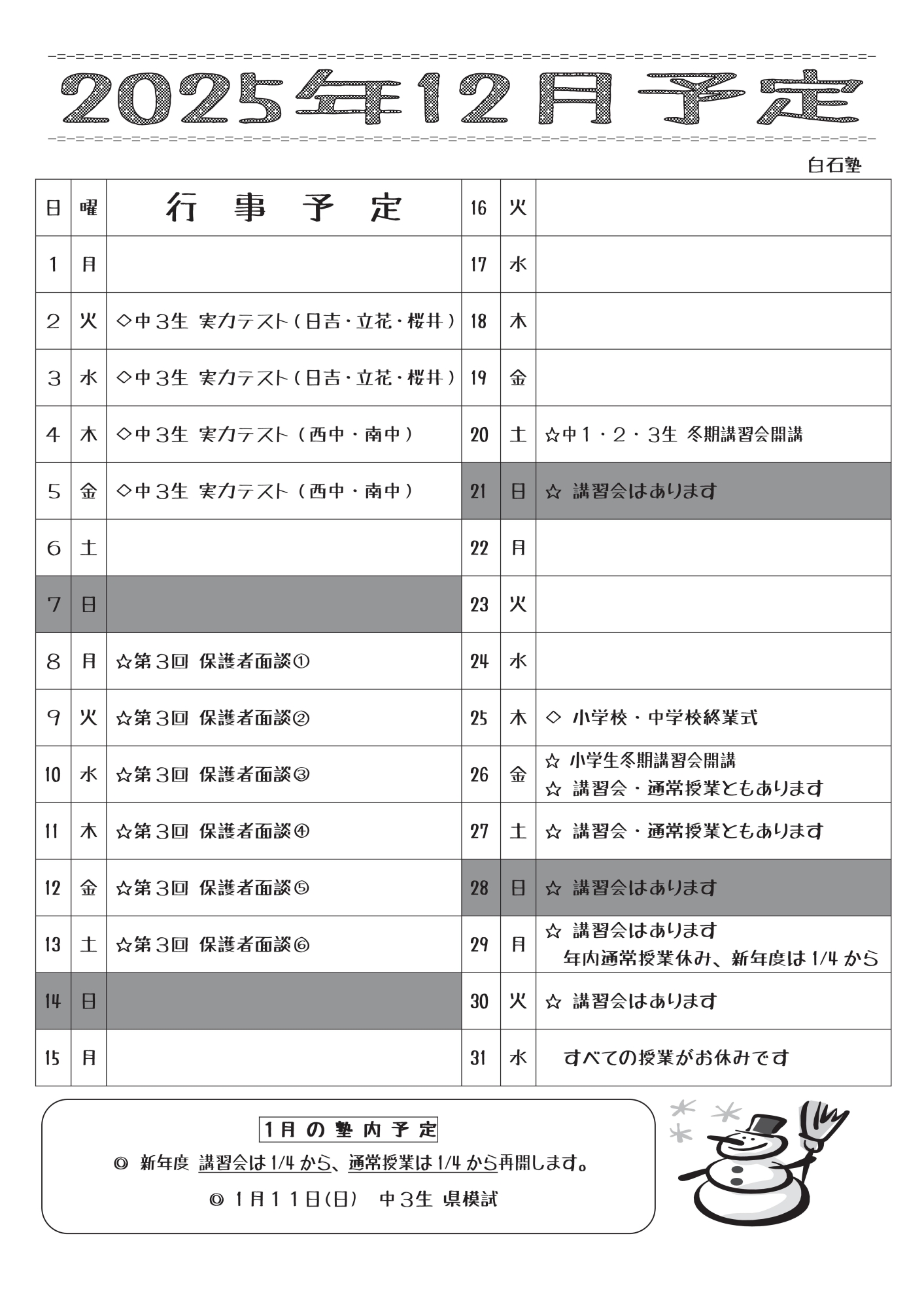 12月の行事予定と講習会の日程表です。